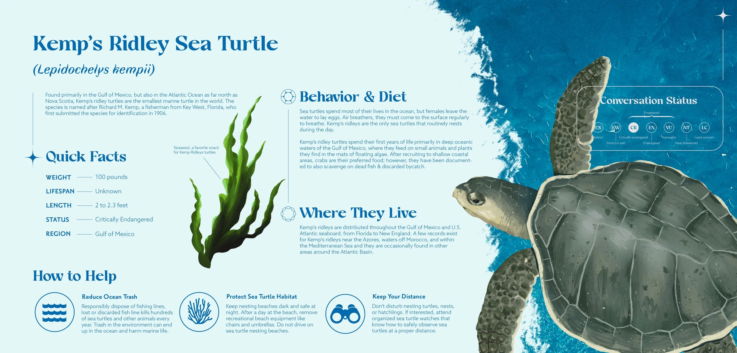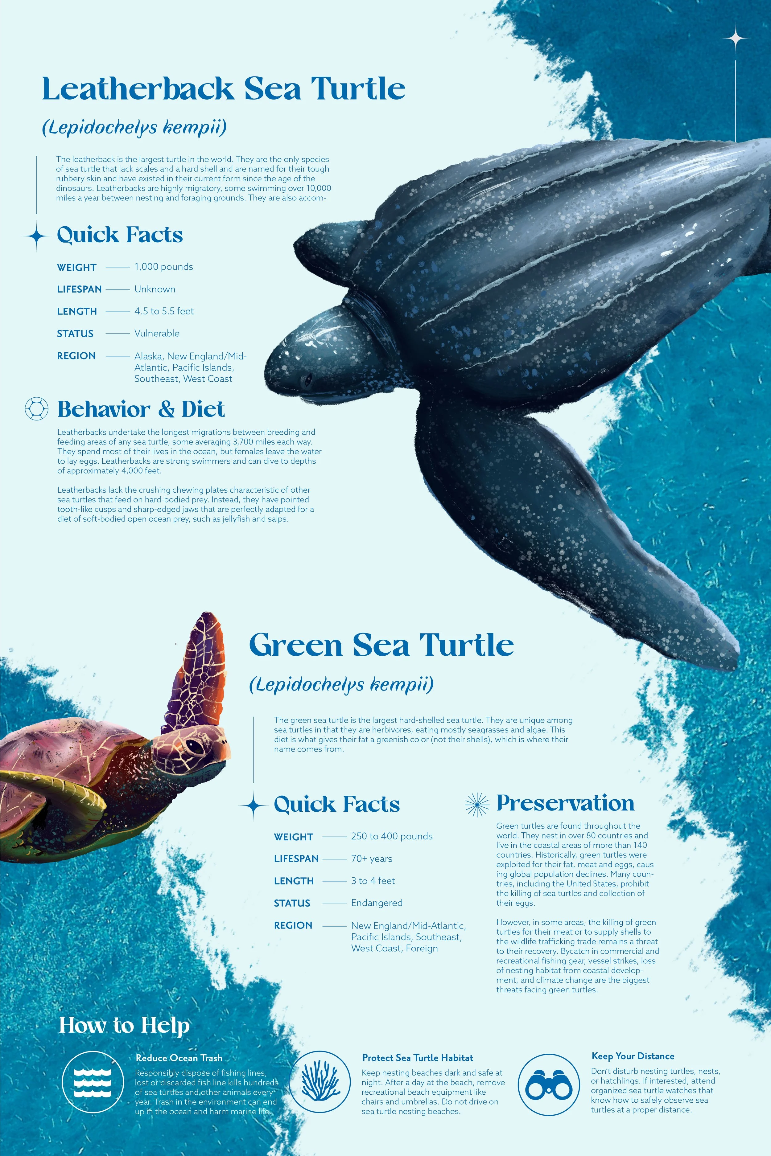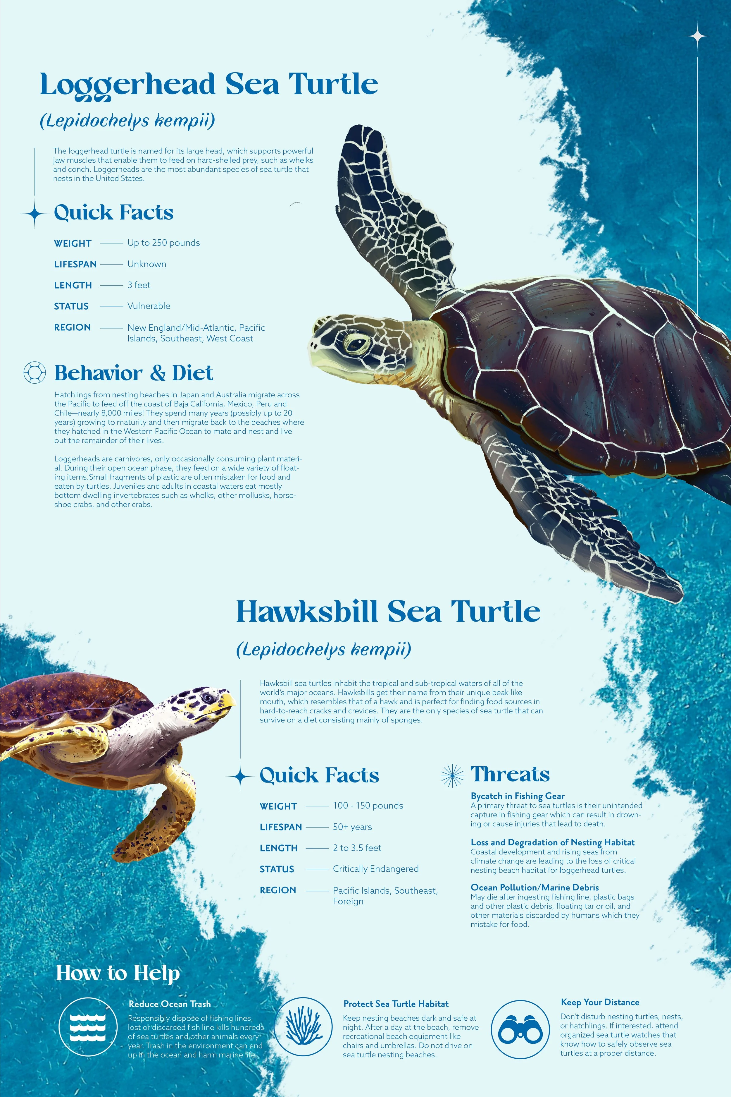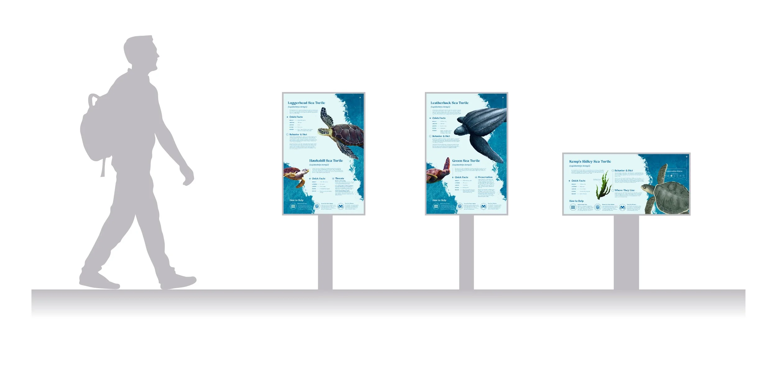 Designed for the UHGD Block program, this conceptual way-finding series combined accessible information design with custom illustration to raise awareness about endangered sea turtles. The project showcased my ability to translate complex data into digestible visuals, utilize illustration for informative storytelling, and design for outdoor environmental contexts.